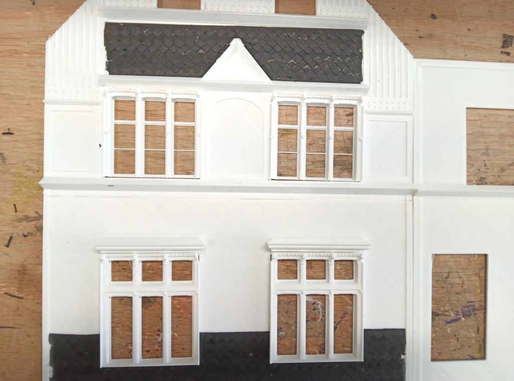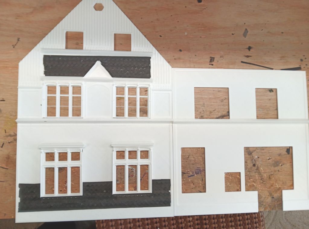 Weitere Tests mit dem Plotter Silhouette Curio und als Material dient Forex 1mm.Schieferstruktur für Bahnhof Loh.Erste Farbversuche mit dem Pinsel waren ernüchternd. :-( Streifen stören. Der Bahnhof Schwelm-Loh schreitet voran.Es ist alles mit dem Plotter geschnitten,auch das Balkenwerk.Das Balkenwerk besteht aus 1mm Balsaholz hinter dem 1mm Forex geklebt ist zur Stabilität. Lackiert wurde mit der Airbrush. Ich habe die unteren Fenster nochmal geändert und am Balkenwerk und den Dachsparren weitergemacht. Der Schwelmer Tunnel gehört auch dazu. Flügel überarbeitet Das ganze jetzt im 3D Druck