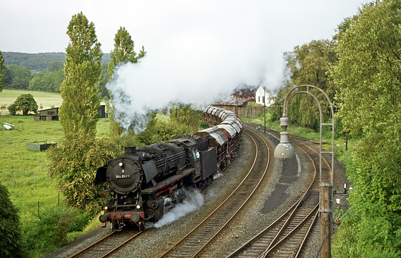15.03.2026 An der unübersehbaren Kilometertafel können wir ablesen wo wir uns am 9. Juli 1974 herumgetrieben haben. An der Osteinfahrt vom Bahnhof Schwelm-Loh. Wieder einmal wurde der Sinterzementzug aus Geseke nach Dornap-