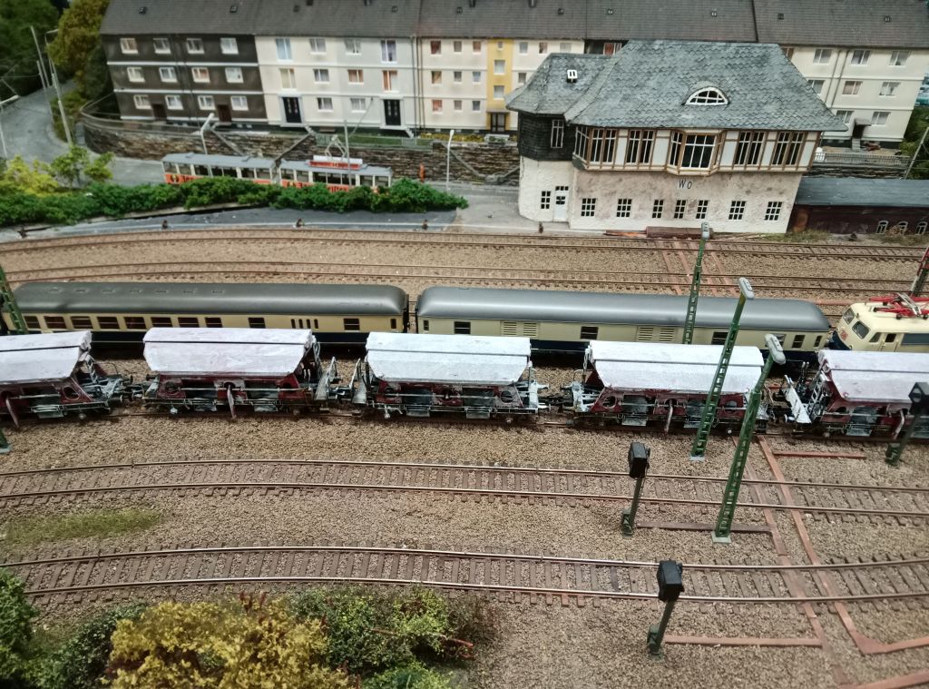 Gleise gebrusht und angefangen zu schottern. Standprobe und Vergleich. Umspannwerk und Hawiko haben ihren Platz erhalten.Immoment bin ich an der Strasse mit Faller Car System dran.Hawiko werde ich nochmal neu bauen,diesmal aus Forex.Die Finnpappe ist dafür zu dünn und zu weich. Hinter dem Umspannwerk befindet sich der Kleingartenverein Neuloh inkl. der Hochspannungsmasten.Das Teilstück habe ich noch nicht ganz fertig,aber die ersten Bilder sind da.Der Gartenteil ist herausnehmbar,darunter ist die Strecke zum Schattenbahnhof.Nach Murphys Gesetz bleibt ja bekanntlich ein Zug da stehen wo man am schlechtesten dran kommt. :-))) Hier mal ein Earth Bild von der Stelle. Die Hochspannungsmasten sind nicht verkabelt wegen der herausnehmbarkeit.Bäume,Büsche und noch ein paar Kleinteile(Deko) fehlen noch. Hawiko befindet sich gerade im Neubau.Es fehlt noch die Dachpappe,dann gibts Bilder. Hawiko ist bis auf die Oberlichter und Schornsteine fertig. Hier mal ein Gesamtbild und die Luftaufnahme dazu.Die Luftaufnahme ist grösser als die anderen Bilder damit man was sehen kann. 05.01.2018 Weiter gehts mit dem Landschaftsbau.Der Schwelmer Tunnel wird eingekleidet. 08.01.2018 Mal eine Übersicht vom Bastel Wochenende.Es fehlen noch einige Details.:-) Das Stellwerk steht nur als Platzhalter bis das Schwelmer fertig ist. 14.01.2018 Weiter gehts mit Schrott Eckhardt. Nun mein schaffen bisher.Den Sand habe ich erst vorhin mit Leim Wasser Gemisch beträufelt und gleichzeitig schwarze Lasur mit drüber laufen lassen.Sieht noch zu frisch aus. Weiter ging es am 20 u. 21.01.Das Dach ist nur probeweise aufgelegt.Muss ja auch abnehmbar bleiben,da ja noch jede Menge Schrott und ein Schrottbagger rein muss.12.02. Fuchs Bagger ist drin. 12.02.2018 Stellwerk Schwelm Loh ist fertig.Maschendrahtzaun um Hawikoin Angriff genommen und alte teilweise ausgebrochene Betonpfostenabsperrung gebaut. An der anderen Seite vom Bahnhof stand noch ein Stellwerk am ende des Bahnsteiges,so wurde mir zugetragen.Auf einem Bild,das 1965 vom Oberloh John F. Kennedy Str.,gemacht wurde erkennt man es mit der Lupe.Da erkennt man auch das der Bahnsteig gar kein Dach hat,sondern nur das Häuschen über den Treppenabgang.Also müsste ich das Dach abreissen und das Stellwerk ans Ende stellen. Soooo,Dächer sind abgerissen und Bahnsteig verlängert. Diese Baustelle am Bahnhof Loh lässt die Feuerwehr anrücken,nebst Krankenwagen,Polizei.Der Strom-und Gasversorger AVU war auch schon alarmiert.Ich hatte zum kleben Uhu Alleskleber genommen und vorher die Bahnsteige mit 2 Komponentenspachtel gespachelt.Mit dem Kleber hatte ich eine ca. 100cm lange Strecke geklebt,also war es ein bischen mehr als üblich.Kurze Zeit später hörte ich jemand im Treppenhaus sagen das es nach Verdünnung riecht.Hab mir nix weiter gedacht,vieleicht der Nachbar oder deren Besuch. 12.03.2018